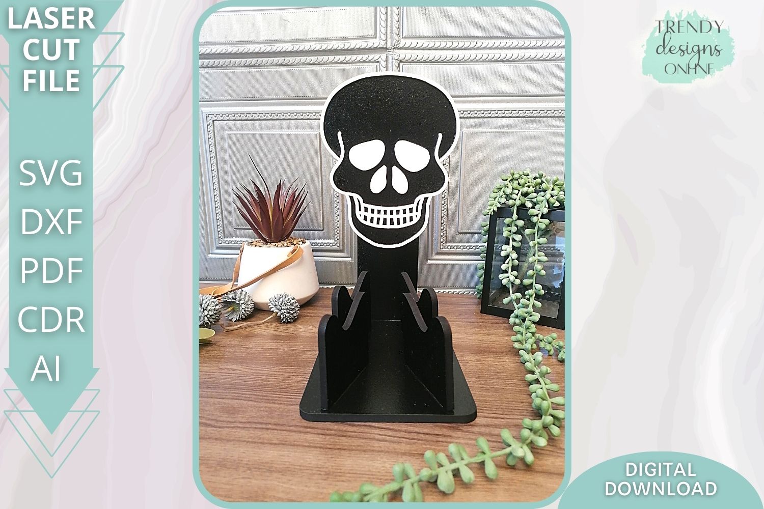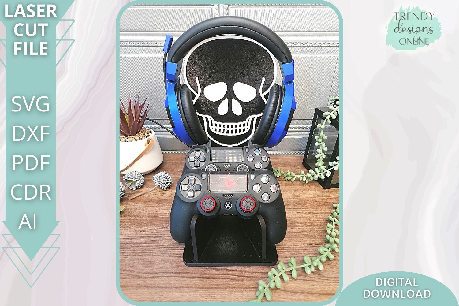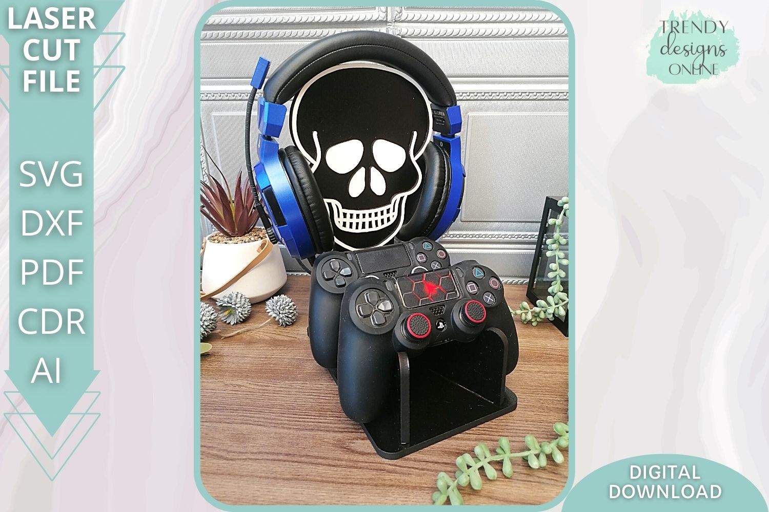 Skull Gamer two Controllers Gothic stand svg file, Glowforge Ready Laser Cut svg, Digital Download, Commercial Use